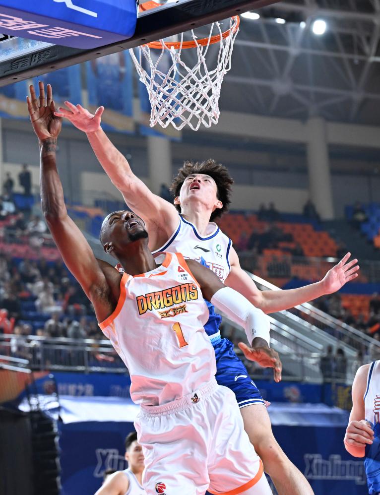 1月11日,新疆伊力特隊球員伊力福拉提(右)在比賽中進攻。新華社發(徐銳 攝)