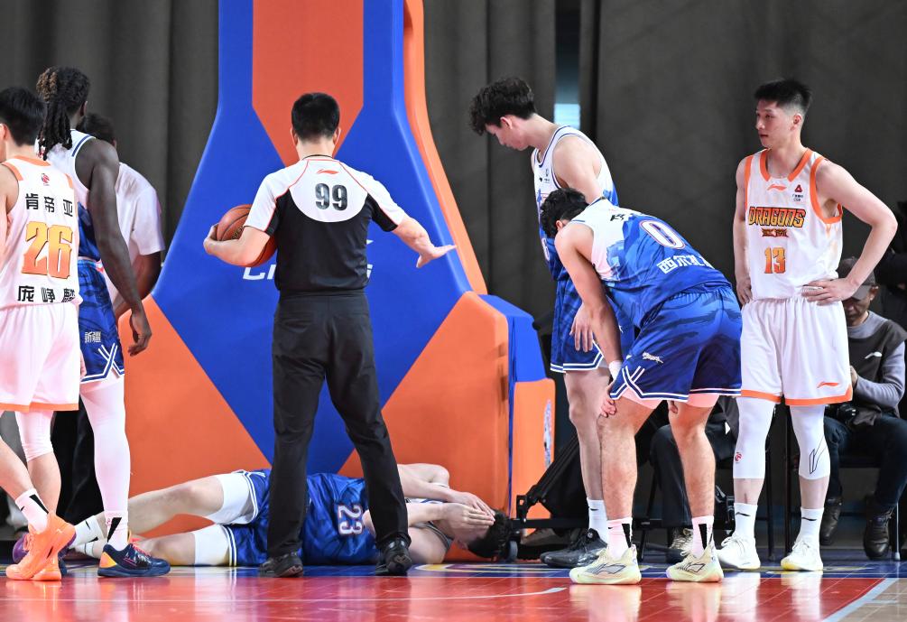 1月11日,新疆伊力特隊球員阿不都沙拉木(下)在比賽中倒地。新華社發(徐銳 攝)