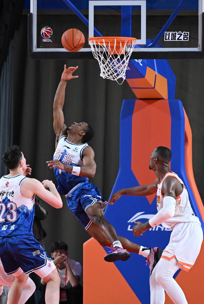 1月11日,新疆伊力特隊球員納托爾(中)在比賽中上籃。新華社發(徐銳 攝)