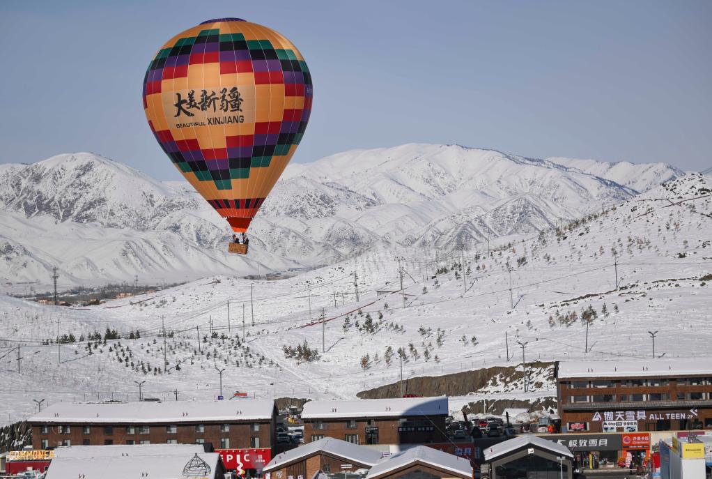 游客在新疆阿勒泰將軍山國際滑雪度假區乘坐熱氣球賞雪景。新華社記者 胡虎虎 攝