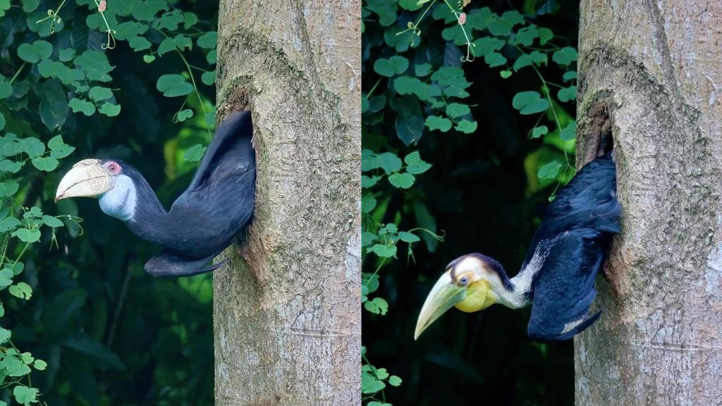 出巢過程中,樹巢外的雄犀鳥率先啄開部分封巢的泥土,樹巢裏的雌犀鳥也開始從裏往外清理封巢的泥土。隨着大部分封泥被清理,雌犀鳥不停地探出頭來觀察周圍環境,待確認安全後,它努力把身體擠出洞外,飛出了樹巢。