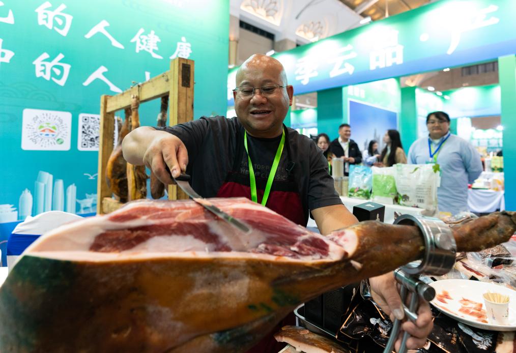 10月13日,一名參展商在雲南國際餐飲美食暨預製菜産業博覽會上切諾鄧火腿。