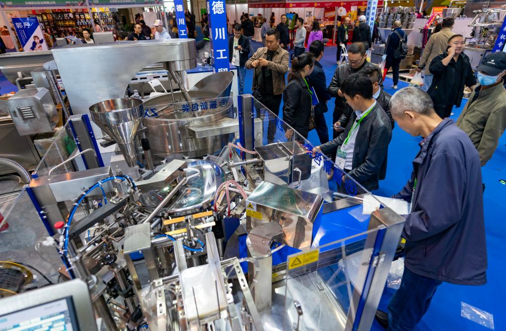 10月13日,參觀者在雲南國際餐飲美食暨預製菜産業博覽會上參觀一台食品包裝設備。