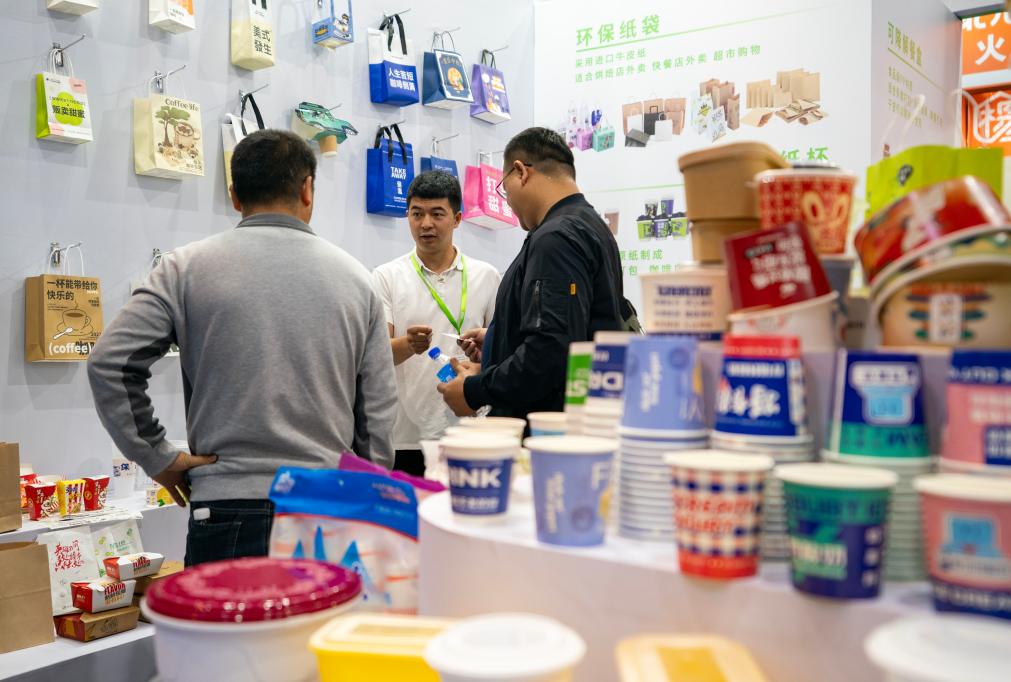 10月13日,一名參展商(左二)在雲南國際餐飲美食暨預製菜産業博覽會上向兩名參觀者介紹食品包裝産品。