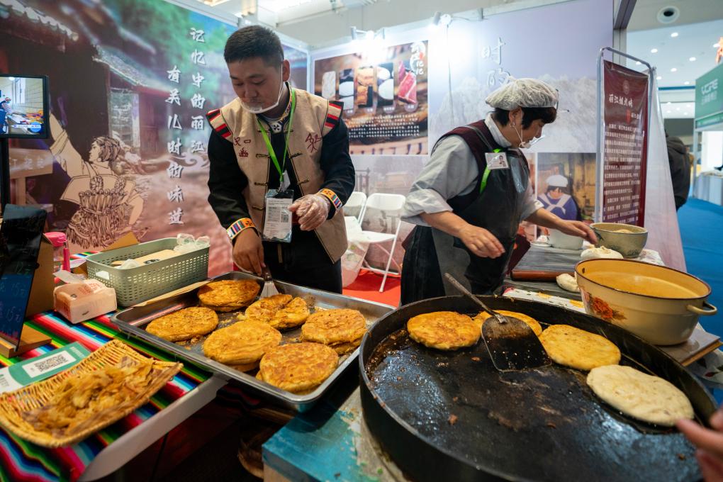 10月13日,兩名參展商在雲南國際餐飲美食暨預製菜産業博覽會上製作麗江粑粑。