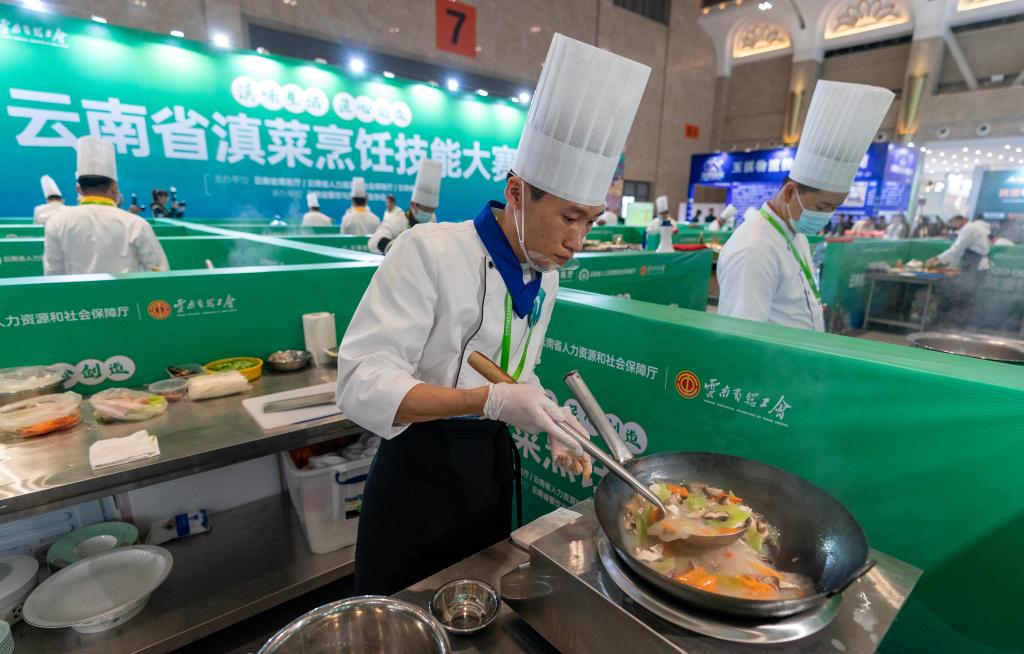 10月13日,參賽選手在雲南國際餐飲美食暨預製菜産業博覽會上參加雲南省滇菜烹飪技能大賽。