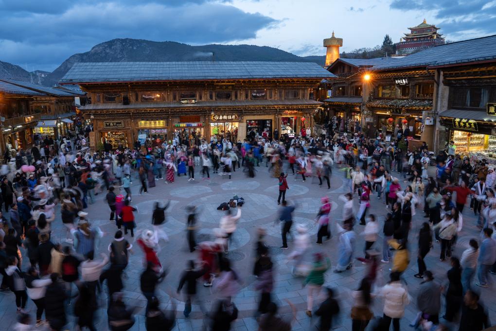 2024年5月3日,在雲南迪慶藏族自治州香格里拉市,游客與當地群眾在獨克宗古城四方街廣場跳鍋莊。新華社發(馬宏波攝)
