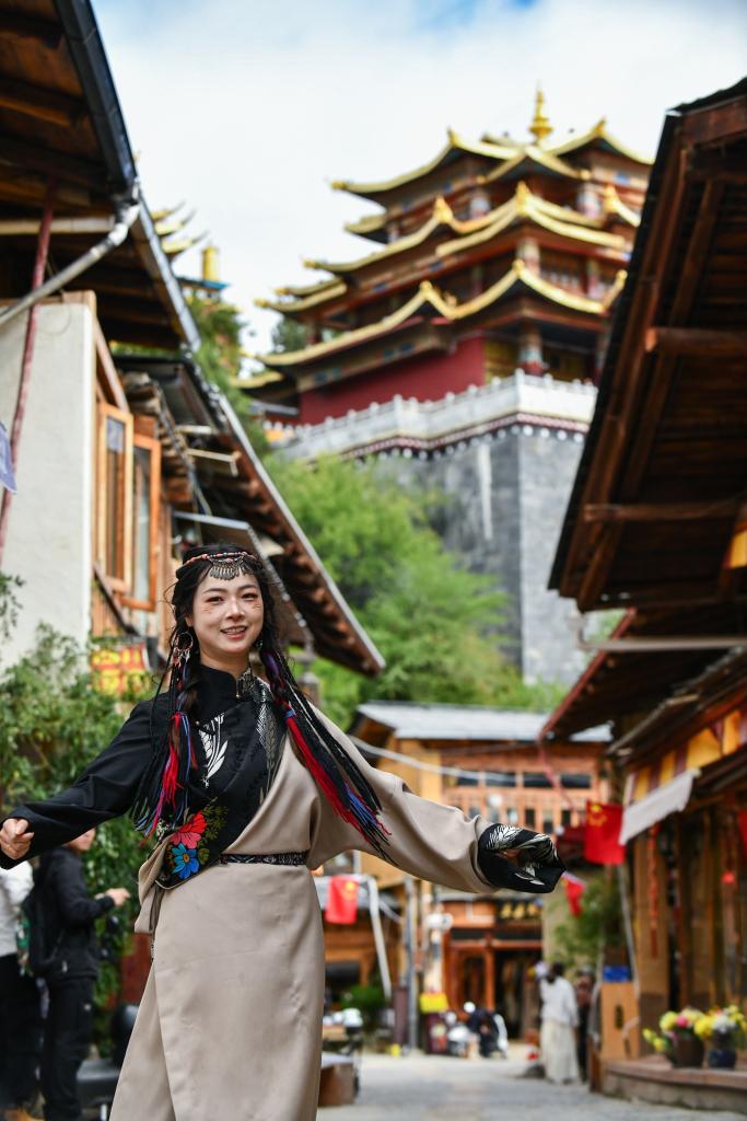 2024年9月27日,游客在獨克宗古城裏體驗旅拍。新華社記者 王靜頤 攝