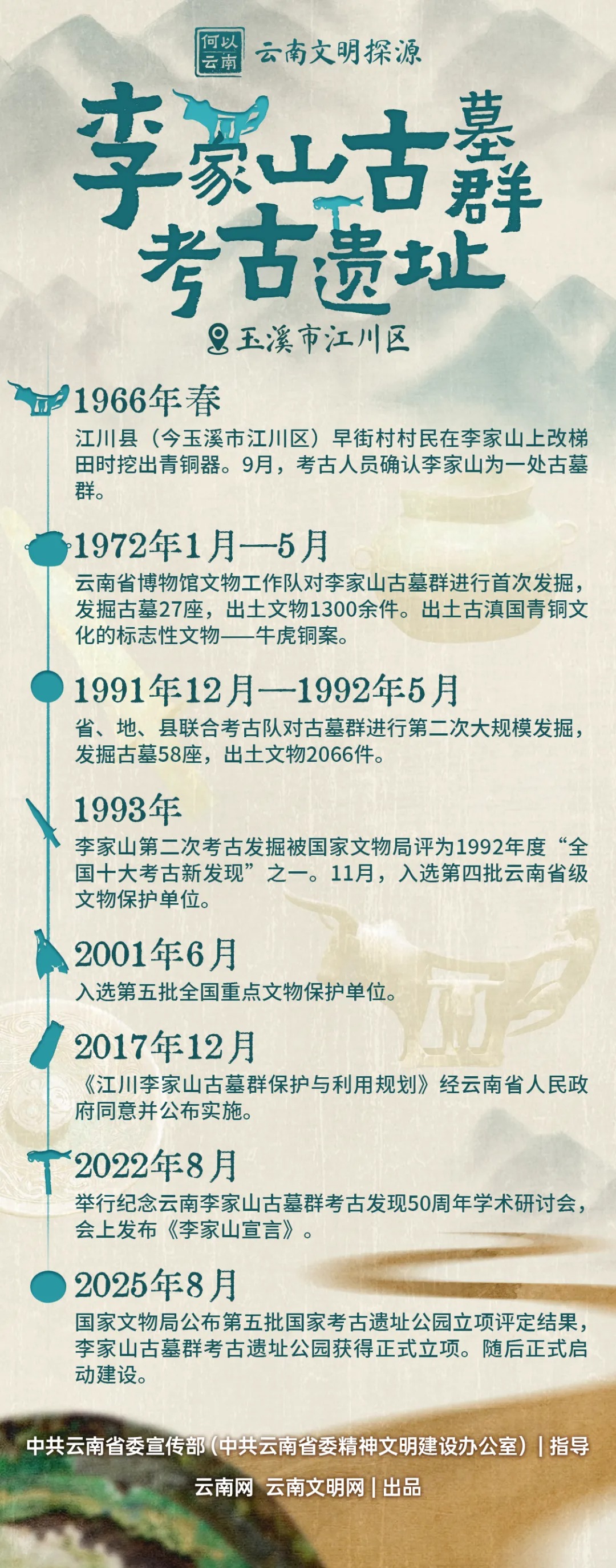 2025年8月,國家文物局公布第五批國家考古遺址公園立項名單,李家山古墓群考古遺址公園獲得正式立項,隨後相關建設全面啟動。這座規劃面積達432.1公頃的公園,將以“中華文明多元一體格局”“古滇文化與墓葬制度”“青銅藝術與技藝”“對外文化交流”為展示主題,打造“青銅鑄史、古滇遺夢、多元一體、四海同風、古韻遺今、守拙歸園、鬱鬱山林”展示分區,構建“核心圈層(展示墓葬遺址本體)—拓展圈層(體驗青銅文化與古滇魅力)—環境圈層(體驗民俗文化與生態環境)”的“三大圈層”整體展示結構,展示以遺産故事線為主線,以環境生態體驗為支線,全面呈現古滇文明的歷史脈絡與文化基因。