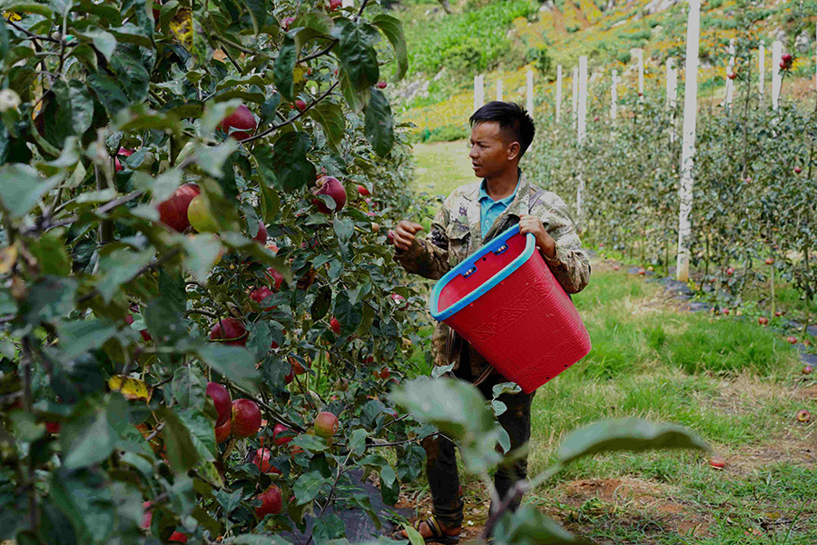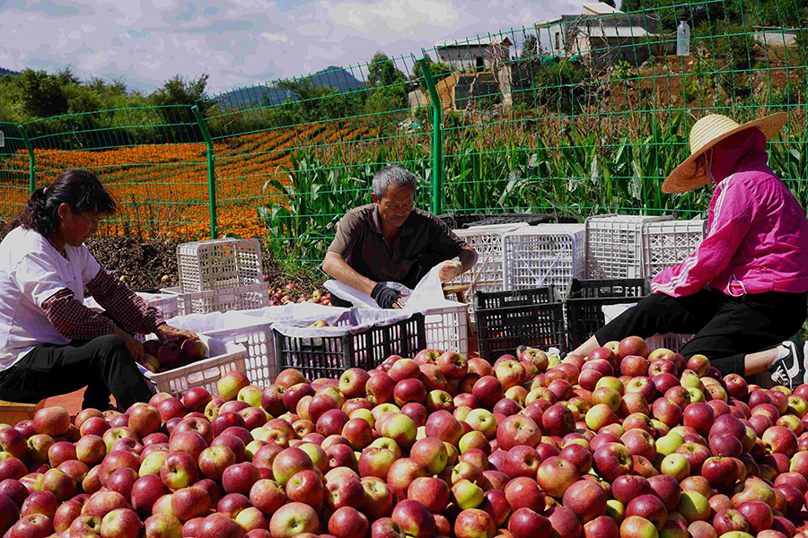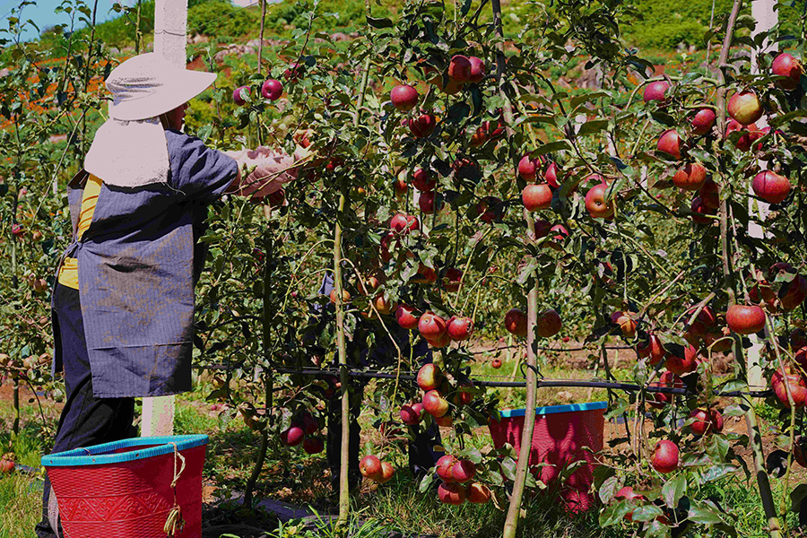 村民在採摘蘋果(攝於7月25日)。鄧敏 攝