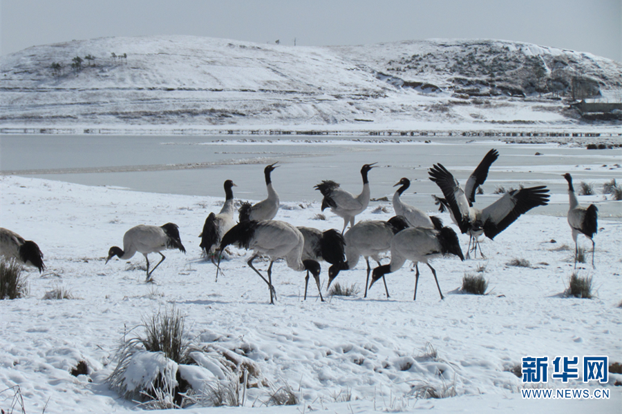 黑頸鶴在白雪中翩翩起舞(11月25日攝)。新華網發(鄭遠見 攝)