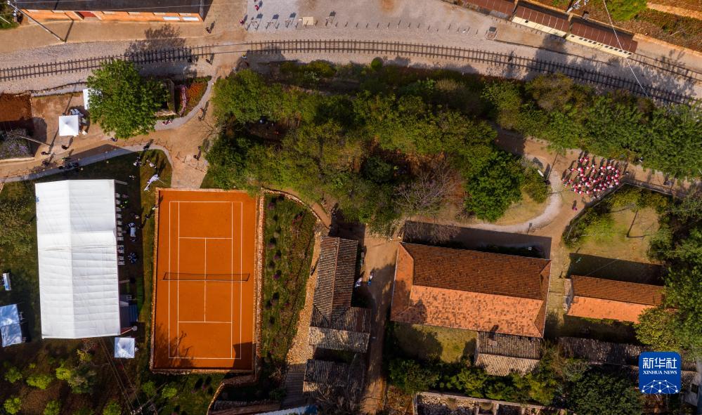 3月30日,現場嘉賓在雲南省蒙自市碧色寨紅土網球場揮拍體驗(無人機照片)。新華社記者 江文耀 攝