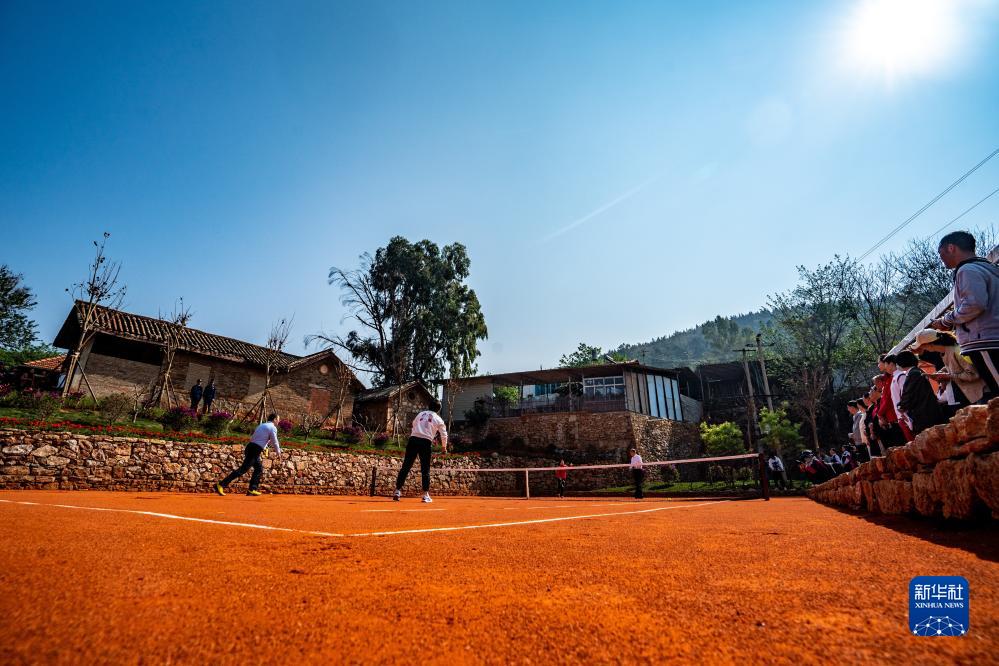 3月30日,現場嘉賓在雲南省蒙自市碧色寨紅土網球場揮拍體驗。新華社記者 江文耀 攝