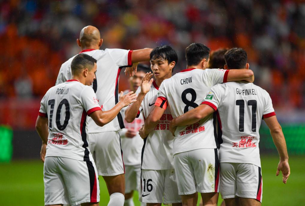 8月23日,成都蓉城隊球員慶祝進球。新華社記者 陳欣波 攝