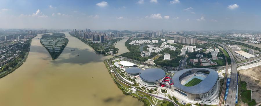 第15回全國運動會でサッカー・シニア女子、バスケットボール・シニア女子の會場となる広東省仏山市順徳區の徳勝スポーツセンターの一角。(10月18日、ドローンから、仏山=新華社記者/鄧華)