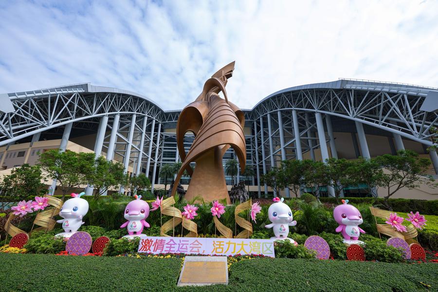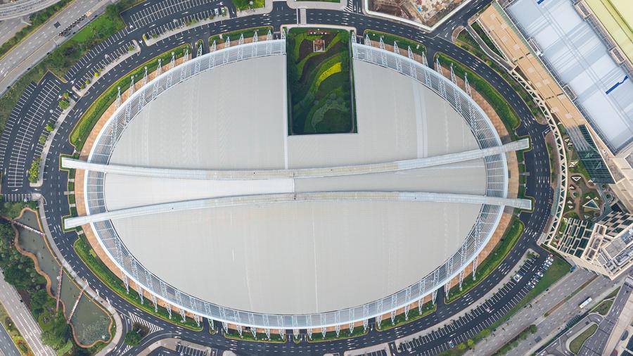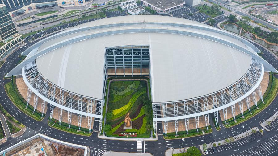 1日、第15回全國運動會でバスケットボール女子U22(22歳以下)、マラソンの會場となる広東省深圳市の深圳灣スポーツセンター。(ドローンから、深圳=新華社記者/梁旭)