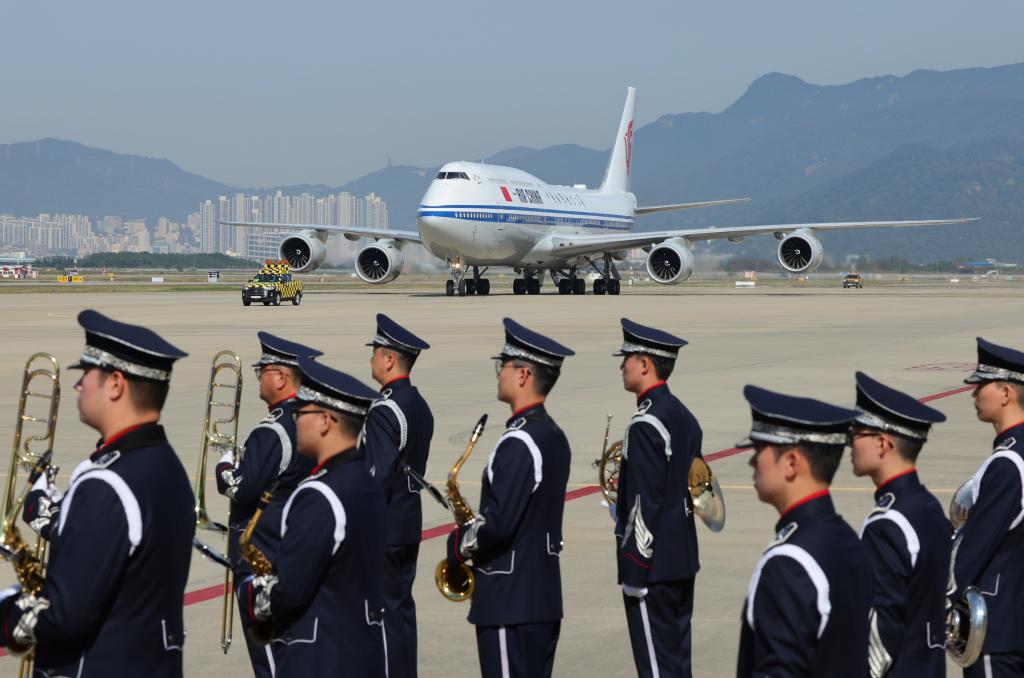 30日、習近平氏を乗せ、韓國に到着した特別機。(釜山=新華社記者/丁林)