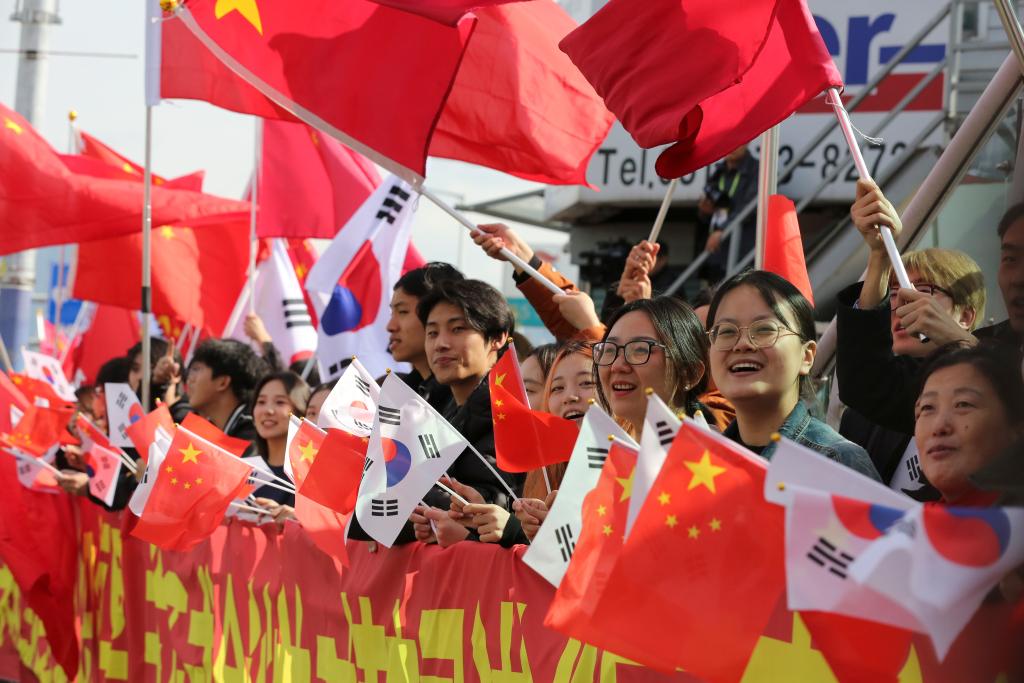 30日、沿道で習近平氏を歓迎する人點。(釜山=新華社記者/姚琪琳)