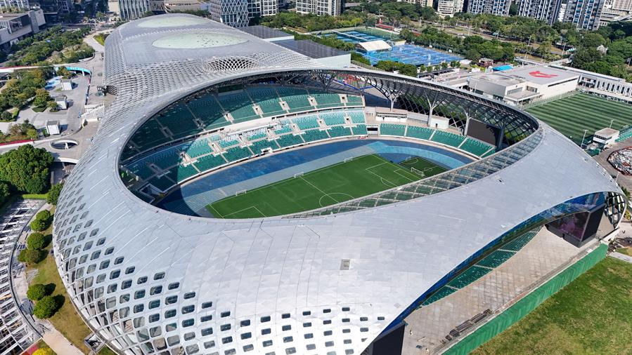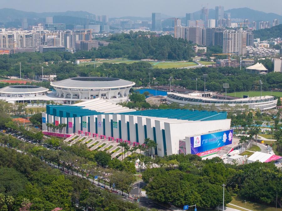 1日、第15回全國運動會でバスケットボール女子U22(22歳以下)、マラソンの會場となる広東省深圳市の深圳灣スポーツセンター。(ドローンから、深圳=新華社記者/梁旭)