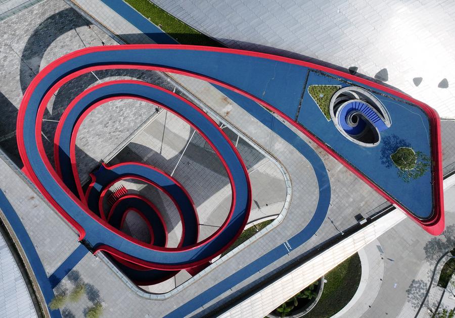 第15回全國運動會でバスケットボール女子U22(22歳以下)、マラソンの會場となる広東省深圳市の深圳灣スポーツセンター。(10月19日、ドローンから、深圳=新華社記者/梁旭)