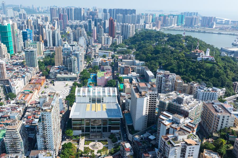 第15回全國運動會で5人制バスケットボール男子U18(18歳以下)の會場となるマカオ塔石體育館。(10月17日、ドローンから、マカオ=新華社配信/張金加)