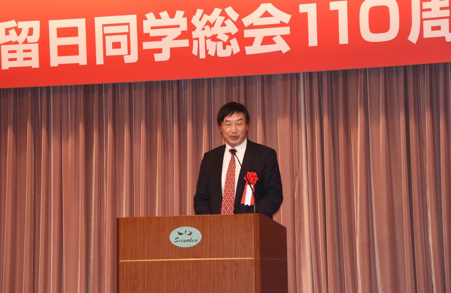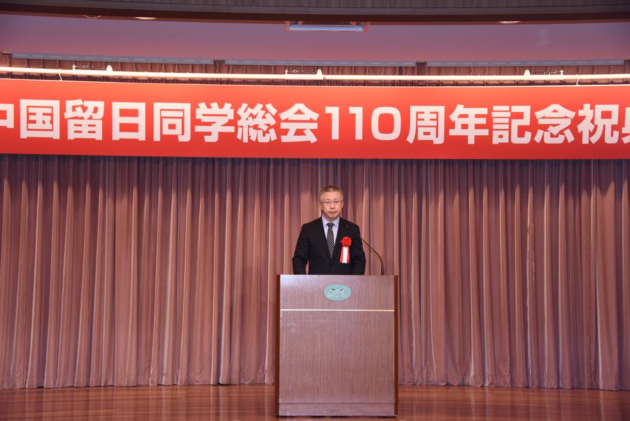 22日、記念祝典であいさつする中國留日同學総會の劉恩璽(りゅう・おんじ)會長。(東京=新華社記者/胡暁格)