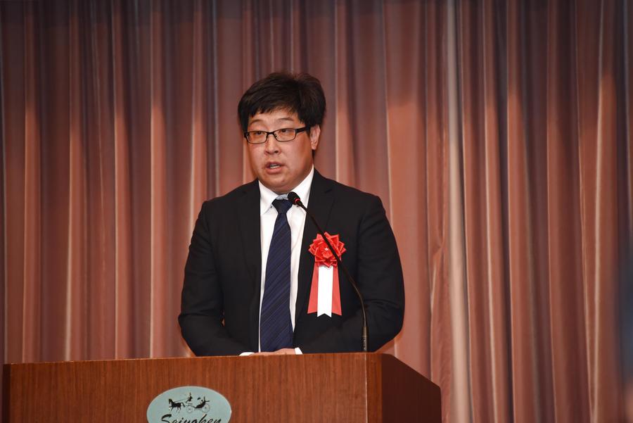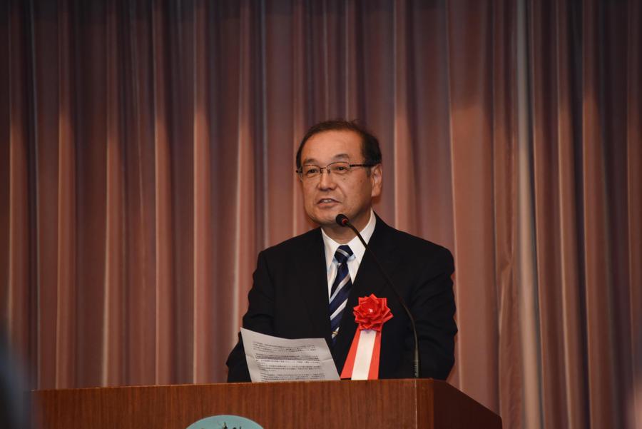 22日、記念祝典で日本學生支援機構の吉岡知哉理事長の祝辭を代読する吉野利雄理事。(東京=新華社記者/胡暁格)