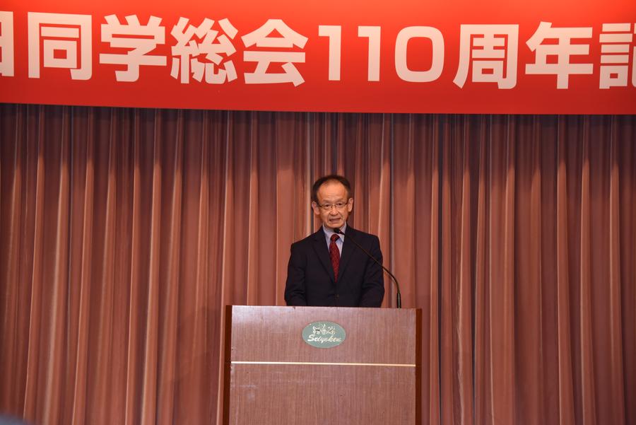 22日、記念祝典であいさつする早稲田大學常任理事の渡邉義浩氏。(東京=新華社記者/胡暁格)