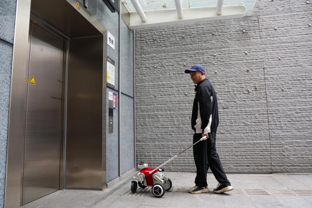 13日、深圳地下鉄の黃木崗交通ハブ駅で、スマート盲導犬を體験する視覚障害者。(深圳=新華社記者/梁旭)