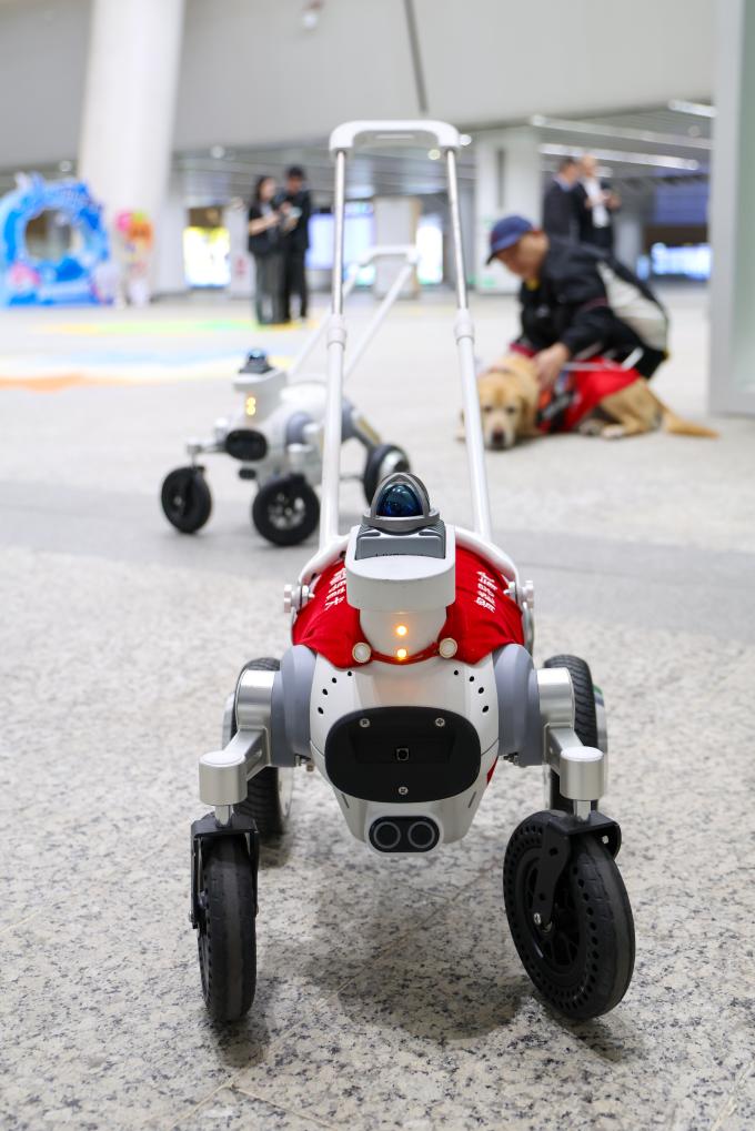 13日、深圳地下鉄の黃木崗交通ハブ駅で撮影したスマート盲導犬「小蒜」。(深圳=新華社記者/梁旭)