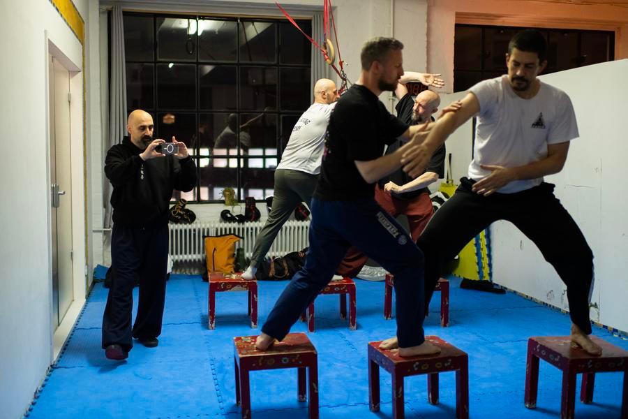 ドイツ・ベルリンの「玄」武術館で受講生に推手を指導するヒメットさん(奧左)。(11月13日撮影、ベルリン=新華社記者/張豪夫)