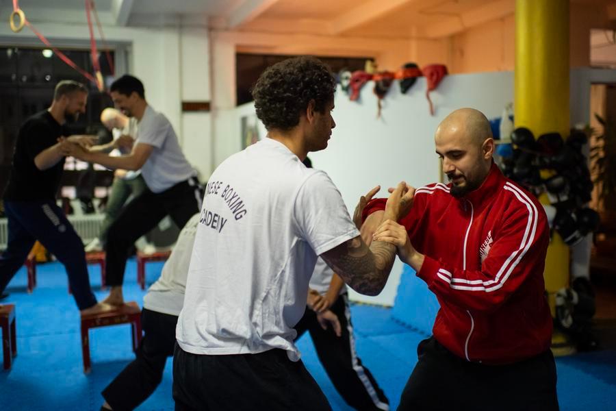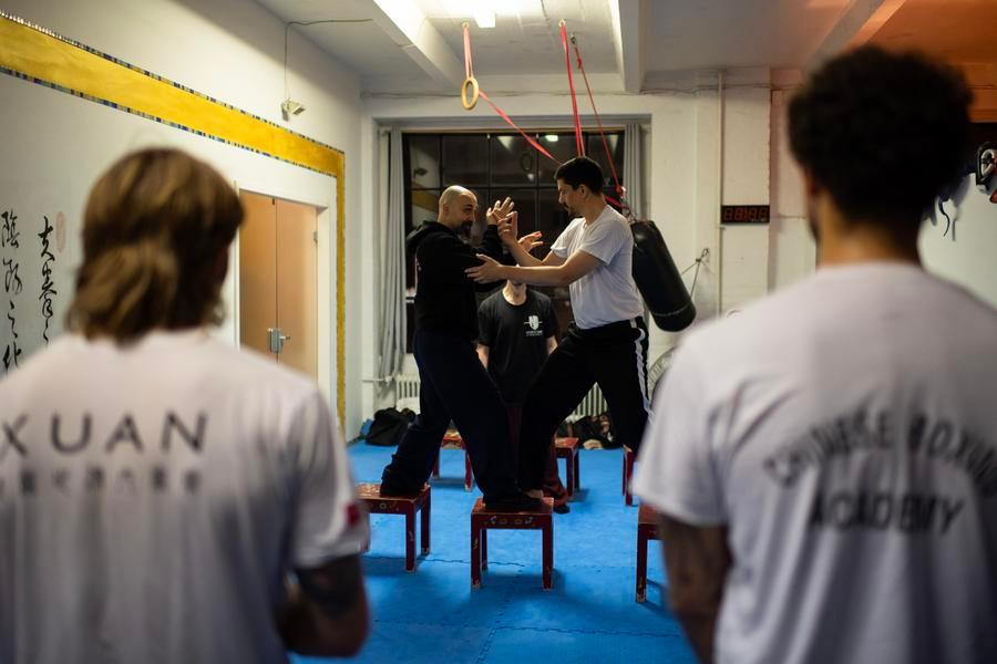 ドイツ・ベルリンの「玄」武術館で、中國武術の組手「推手」を練習する受講生。(11月13日撮影、ベルリン=新華社記者/張豪夫)