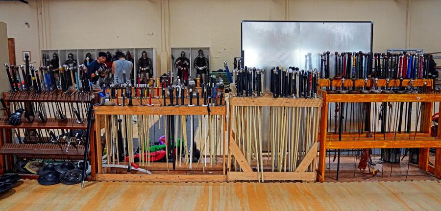 上海歴史武術クラブに並ぶドイツ武術で使用する器具や設備。(11月22日撮影、上海=新華社記者/劉穎)