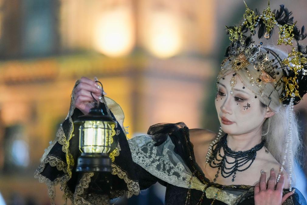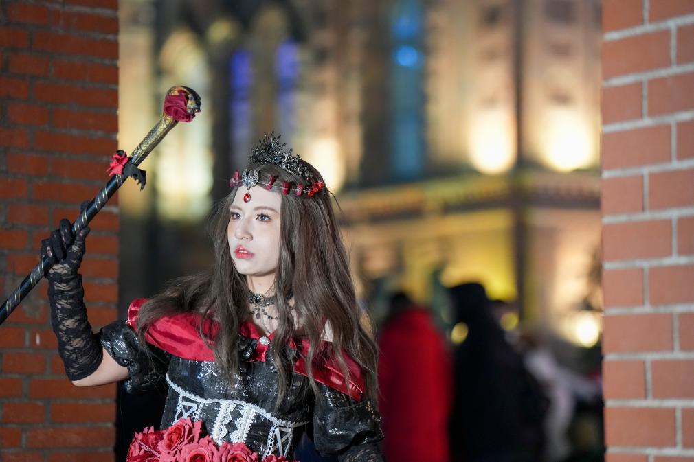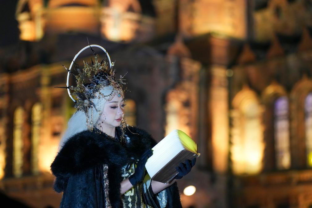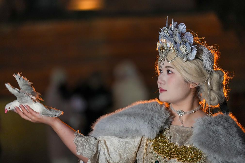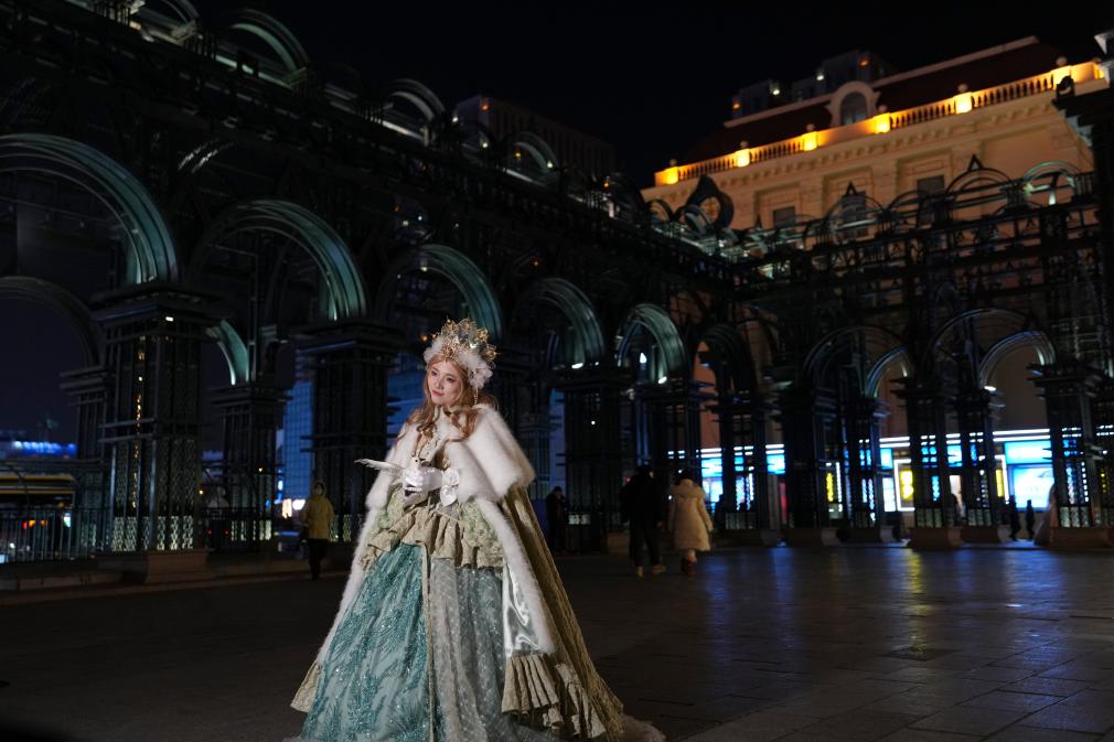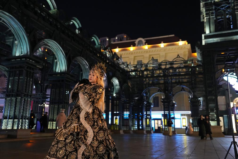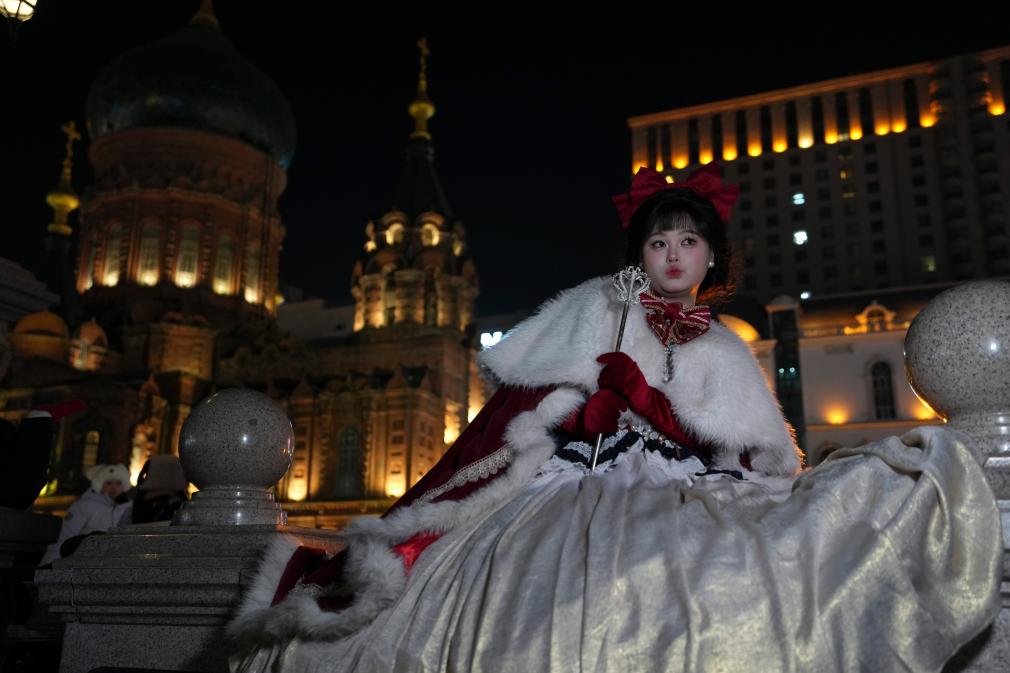 【新華社ハルビン12月17日】中國黒竜江省ハルビン市のランドマーク、聖ソフィア大聖堂周辺の広場は、豪華なドレス姿で寫真撮影を楽しむ観光客でにぎわっている。