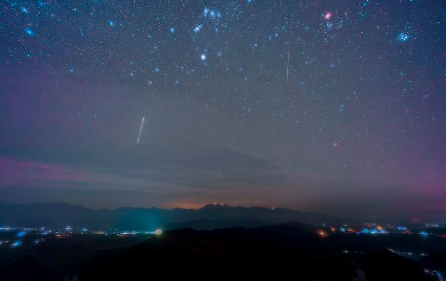 14日、広西チワン族自治區賀州市の岔山村で寫真愛好家が撮影したふたご座流星群。(賀州=新華社配信/黎鴻飛)