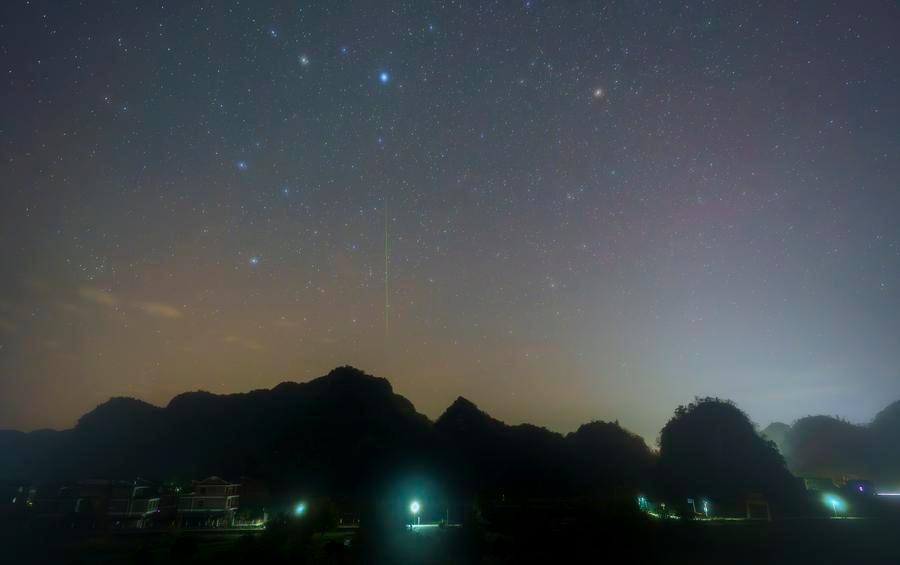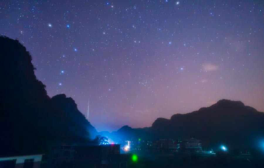 【新華社賀州12月20日】中國広西チワン族自治區賀州市の岔山村でこのほど、寫真愛好家がカルスト地形の山間に見えるふたご座流星群を撮影した。