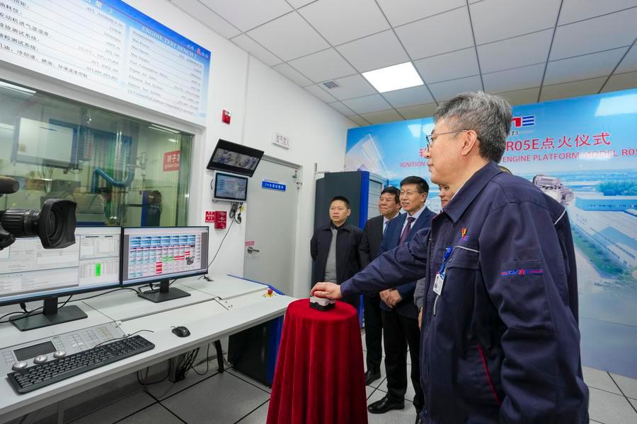 19日、「R05E」試作機の點火スイッチを押すハルビン東安汽車動力の趙興天(ちょう・こうてん)副総経理(右)。(ハルビン=新華社記者/王松)