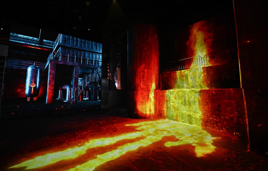 18日、沒入感のある光と影の演出で、高爐から溶銑が流れ出す光景を再現した「鋼鉄時代」沒入型展の「高爐劇場」エリア。(北京=新華社記者/陳鍾昊)