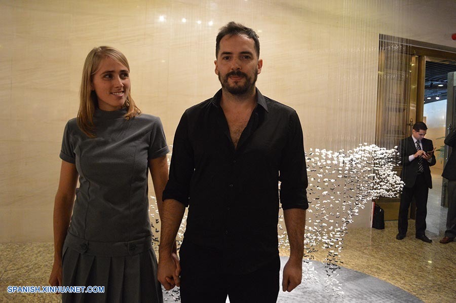 El poeta y artista visual de Uruguay y la artista uruguaya Valentina Cardellino con su obra (Xinhuanet/Gong Xuemei)