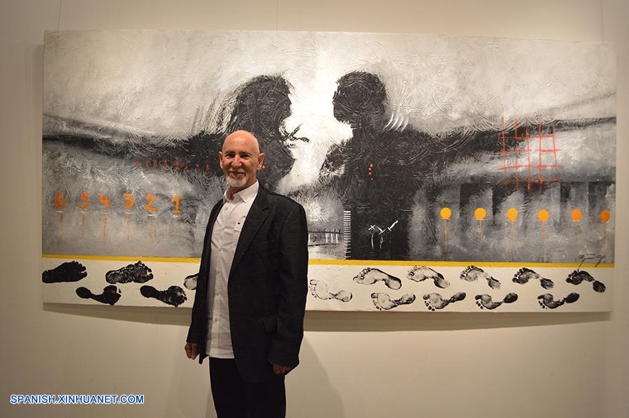 El pintor colombiano Álvaro Daza con su obra (Xinhuanet/Gong Xuemei)