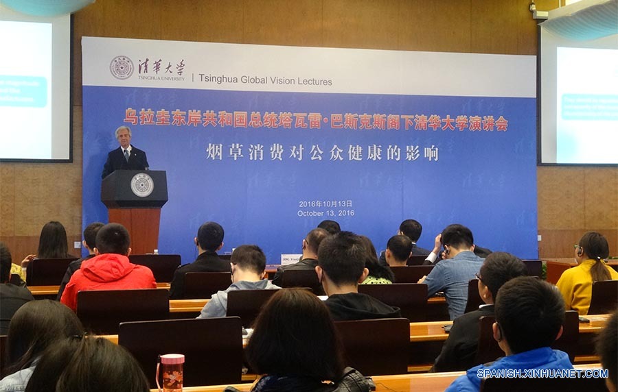 El presidente de Uruguay, Tabaré Vázquez, dio una conferencia ayer jueves en la Universidad de Tsinghua de Beijing para hablar de los peligros del tabaco y la experiencia de su país, que ha logrado reducir el consumo a través de medidas normativas. (Xinhuanet/Gong Xuemei)