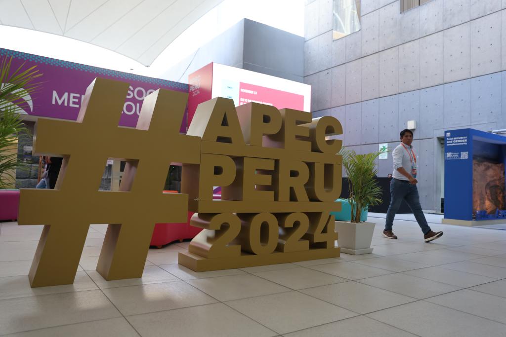 LIMA, 14 noviembre, 2024 (Xinhua) -- Imagen del 13 de noviembre de 2024 del logotipo de APEC 2024 en el Centro Internacional de Prensa de APEC 2024, en Lima, Perú. La 31ª Reunión de Líderes Económicos de APEC se llevará a cabo en Lima. (Xinhua/Li Mengxin)