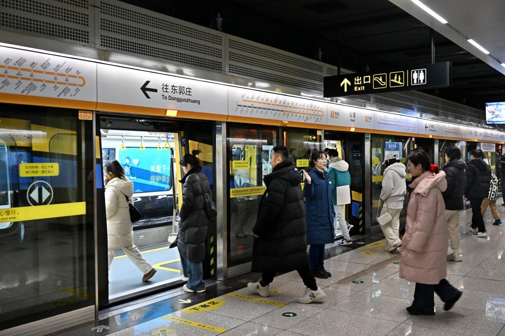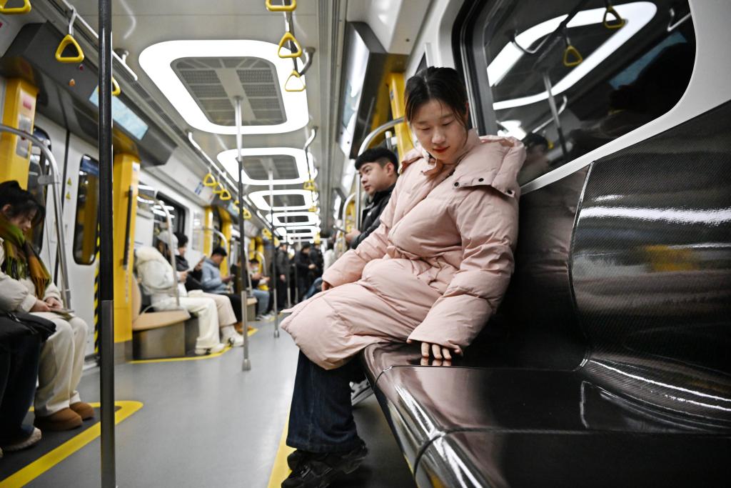 QINGDAO, 10 enero, 2025 (Xinhua) -- Pasajeros toman un tren de metro CETROVO 1.0 en la Línea 1 del Metro, en Qingdao, en la provincia de Shandong, en el este de China, el 10 de enero de 2025. El vagón de metro CETROVO 1.0 comenzó su operación en la Línea 1 del Metro de Qingdao el viernes. Con un cuerpo y un marco compuestos de fibra de carbono, es más ligero y más eficiente energéticamente que el tren de metro tradicional. (Xinhua/Li Ziheng)