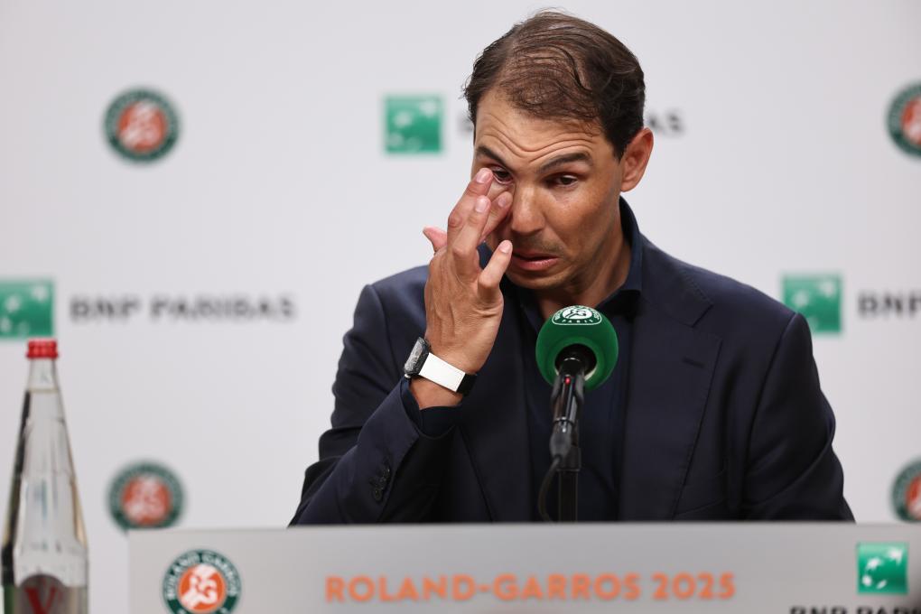 PARIS, 26 mayo, 2025 (Xinhua) -- Imagen del 25 de mayo de 2025 del ex tenista español, Rafael Nadal, reaccionando durante una conferencia de prensa después de una ceremonia para honrar su carrera, durante el torneo de tenis Abierto de Francia, en la Cancha Philippe Chatrier, en Roland Garros, en París, Francia. (Xinhua/Li Jing)