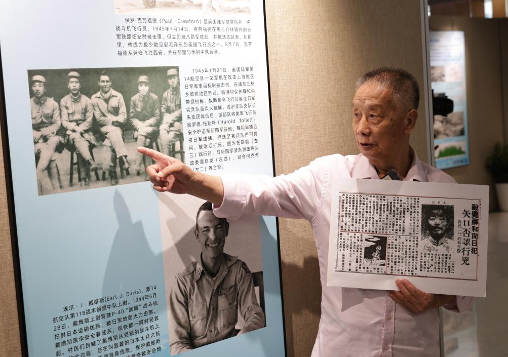 SHANGHAI, 8 julio, 2025 (Xinhua) -- Un descendiente de un nativo de Shanghai que fue asesinado por los invasores japoneses por rescatar a miembros en apuros de los Tigres Voladores relata la historia de su antepasado en la Exposición Fotográfica de los Tigres Voladores, en Shanghai, en el este de China, el 8 de julio de 2025. Bajo el lema "Recordando a los héroes y creando el futuro juntos", la exposición se inauguró aquí el martes, mostrando cientos de fotografías valiosas, así como otros artículos de importancia histórica aportados por los veteranos de los Tigres Voladores. (Xinhua/Fang Zhe)