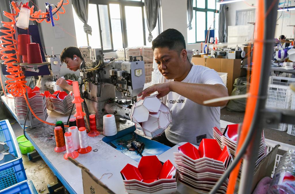 YIWU, 15 septiembre, 2025 (Xinhua) -- Trabajadores fabrican balones de fútbol en una empresa local de artículos deportivos, en Yiwu, en la provincia de Zhejiang, en el este de China, el 15 de septiembre de 2025. Yiwu de China, conocida como "el supermercado del mundo", ha sido testigo recientemente de un aumento en los pedidos de productos deportivos, impulsado por importantes eventos deportivos, como la próxima Copa Mundial de la FIFA 2026. (Xinhua/Shi Kuanbing)
