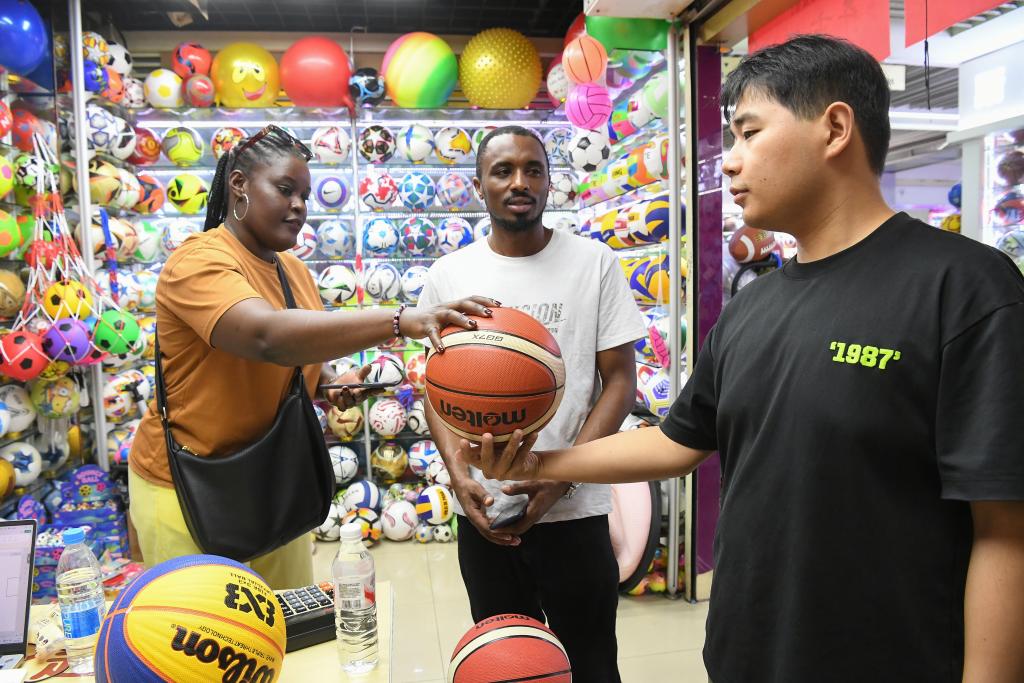 YIWU, 15 septiembre, 2025 (Xinhua) -- Clientes extranjeros compran artículos deportivos, en la Ciudad Comercial Internacional de Yiwu, en Yiwu, en la provincia de Zhejiang, en el este de China, el 15 de septiembre de 2025. Yiwu de China, conocida como "el supermercado del mundo", ha sido testigo recientemente de un aumento en los pedidos de productos deportivos, impulsado por importantes eventos deportivos, como la próxima Copa Mundial de la FIFA 2026. (Xinhua/Shi Kuanbing)