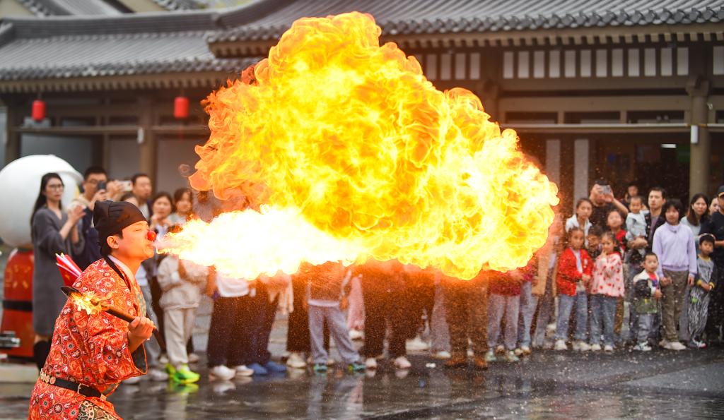 LUOYANG, 5 octubre, 2025 (Xinhua) -- Un artista folklórico realiza una presentación para los turistas en un punto escénico de una antigua calle, en el distrito de Luolong de Luoyang, en la provincia de Henan, en el centro de China, el 5 de octubre de 2025. Los destinos turísticos de toda China están experimentando un aumento en el número de visitantes desde que el miércoles comenzó el feriado de ocho días por el Día Nacional y el Festival del Medio Otoño. (Xinhua/Huang Zhengwei)