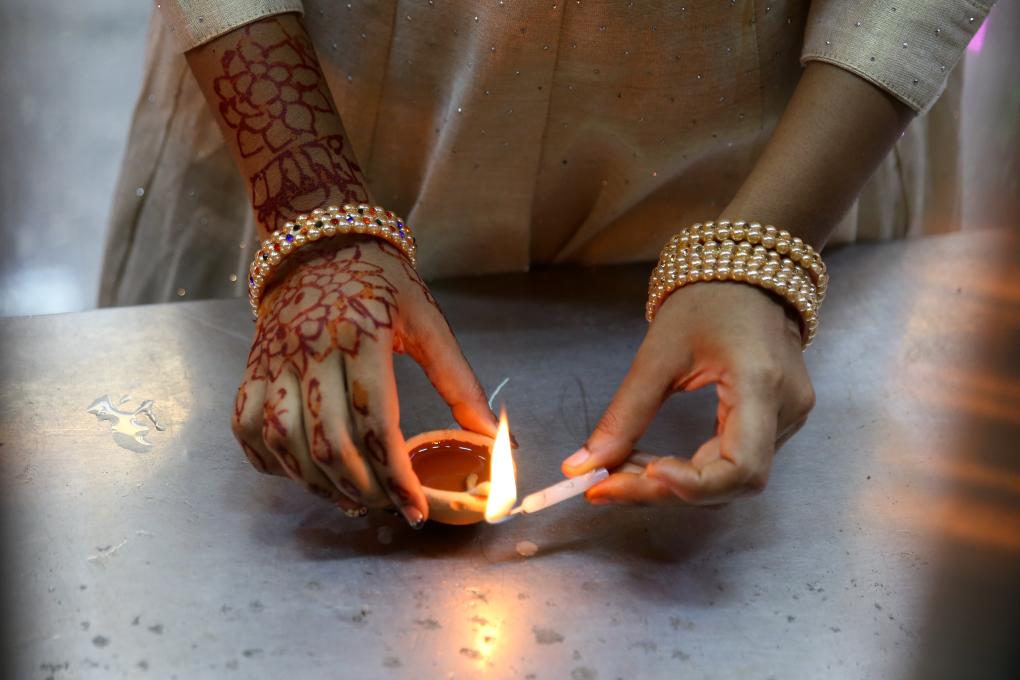 YANGON, 20 octubre, 2025 (Xinhua) -- Mujeres encienden lámparas de aceite para celebrar el Diwali, o festival hindú de las luces, en un templo hindú, en Yangón, Myanmar, el 20 de octubre de 2025. (Xinhua/Myo Kyaw Soe)