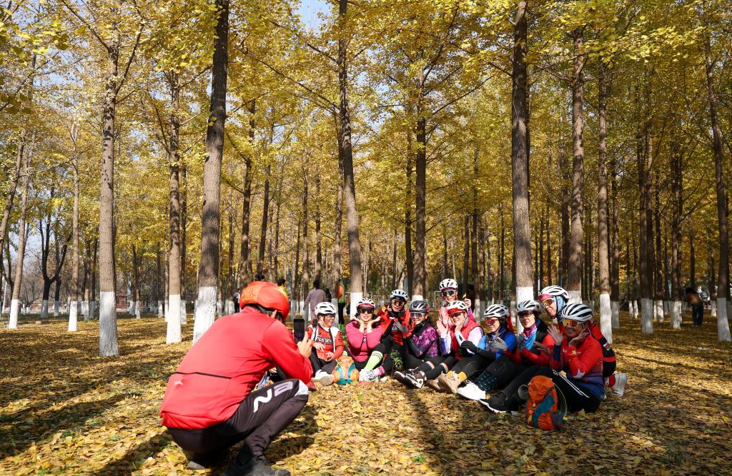 BEIJING, 5 noviembre, 2025 (Xinhua) -- Vista aérea tomada con un dron el 3 de noviembre de 2025 de personas admirando los árboles de ginkgo, en la ciudad de Zouping, en la provincia de Shandong, en el este de China. (Xinhua/Dong Naide)